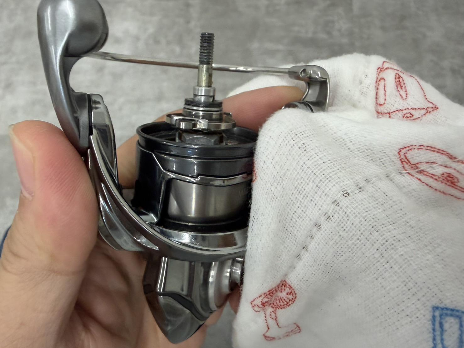 『手拭い』か『ふきん』を濡らしてリール本体を拭きます。